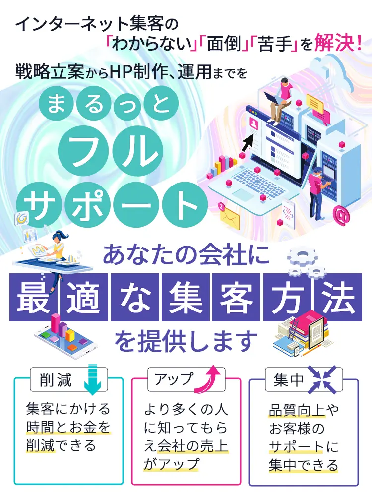 ホームページ制作からSNS各種アカウントの作成、運用アドバイス、WEB広告運用まで幅広く対応しておりますので、あなたの会社に最適なインターネット集客方法を提供します。